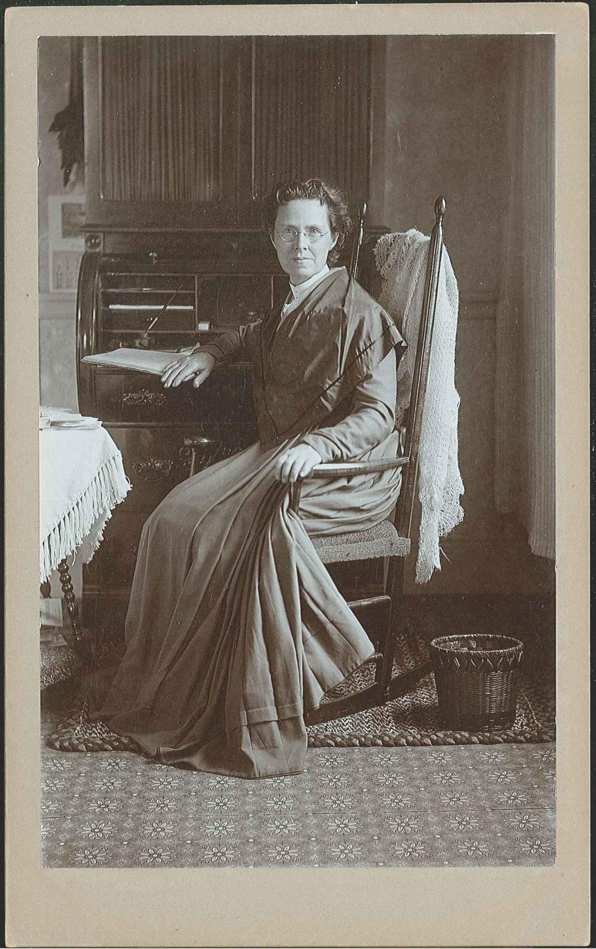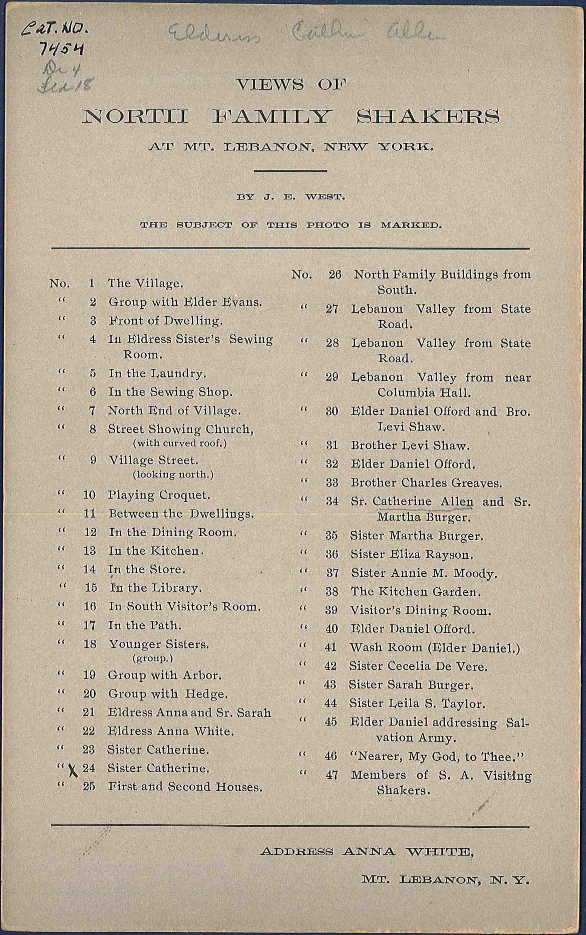 This portrait of Eldress Catherine Allen is part of the series "Views of the North Family Shakers at Mt. Lebanon, New York" produced by James E. West. It is identified as view number 24 in his series of 47 views, where it is titled, "Sister Catherine."
