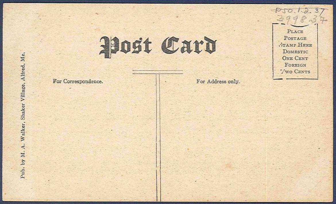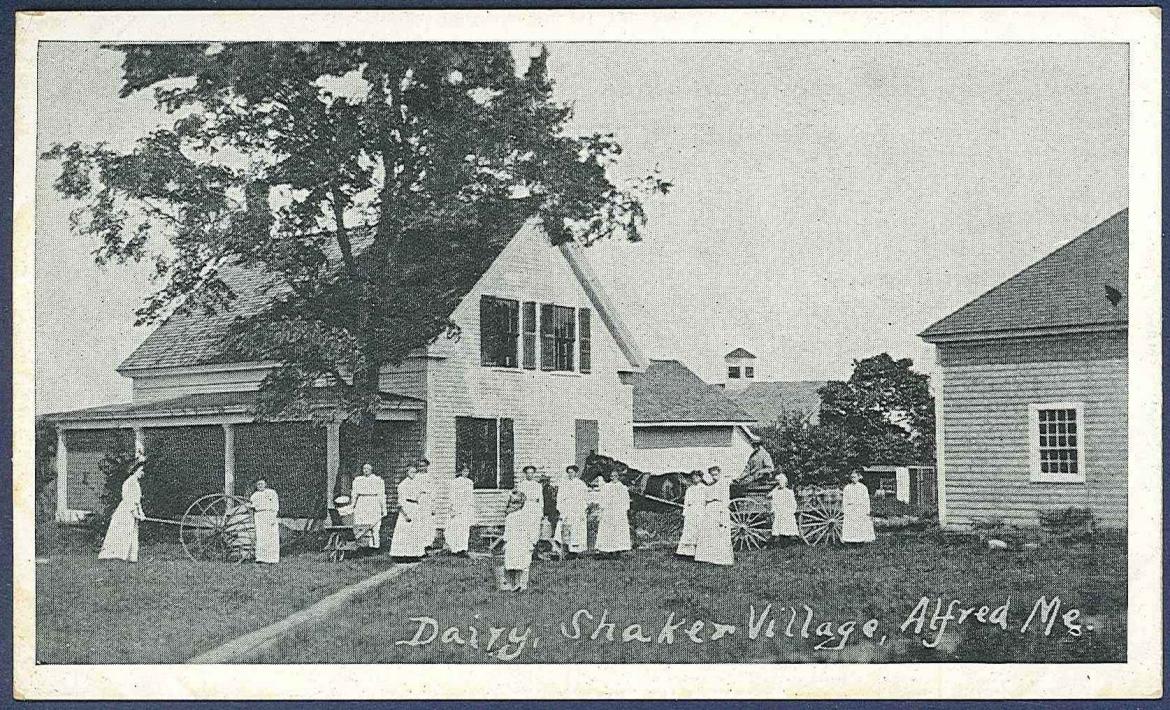 Although the photographer of this view is not identified, the card was published by "M. A. Walker, Shaker Village, Alfred, Me." Eldress Mary Ann Walker, along with Eldress Harriett Coolbroth, had largely been responsible for a number of young women becoming Shakers at Alfred and by doing so were able to sustain the community at Alfred until it closed in 1931 and these young sister added a great amount to the vitality of the Sabbathday Lake community when they moved there after 1931.