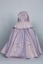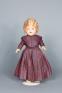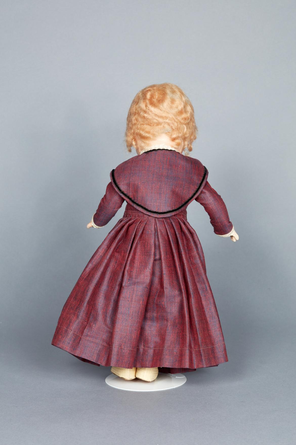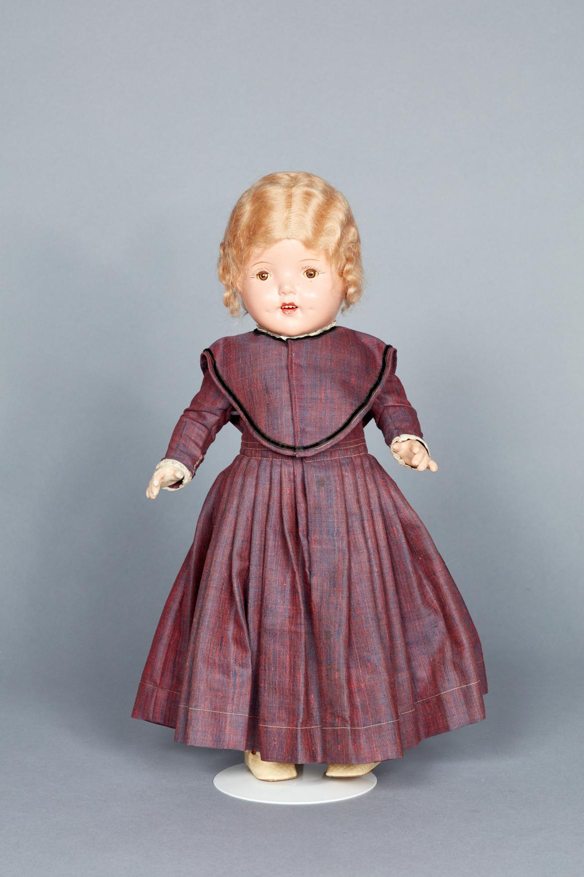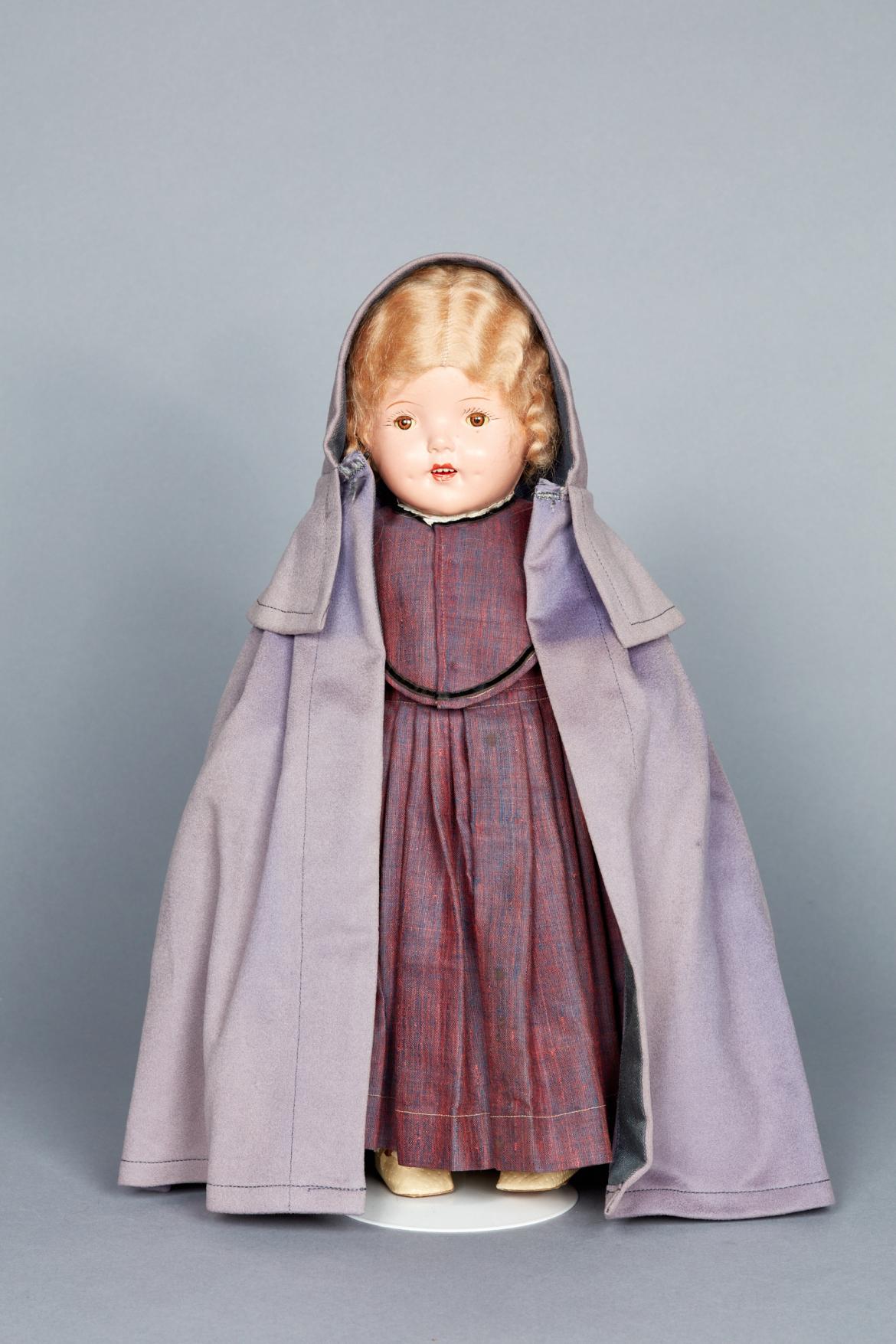 Plaster and plastic doll (a) with peach-colored skin and movable arms and legs. Blonde, acrylic wig, close-able eyes, sculptured teeth and hand-painted face. Kneecaps have rosy hue. Shaker style cloak (b) with hood made with light purple fleece; hood lined in navy blue satin. Purple/pink denim overshot dress (c) with pleated skirt, long sleeves, and lace cuffs. Removable collar (d) made of same material as (c), comes to a point at waist, edged in black velvet and lace collar. White, cotton, pleated petticoat (e) with pink silk tie. White, Cotton slip (f) with cap sleeves that hits mid-calf. Yellow textured vinyl shoes (g,h) that reach ankle. Brown bottom and plastic, silver buckle. Tied with non-historic twill tape. Cream-colored loosely crocheted stocking (i,j). White cotton pantaloons (k).