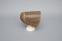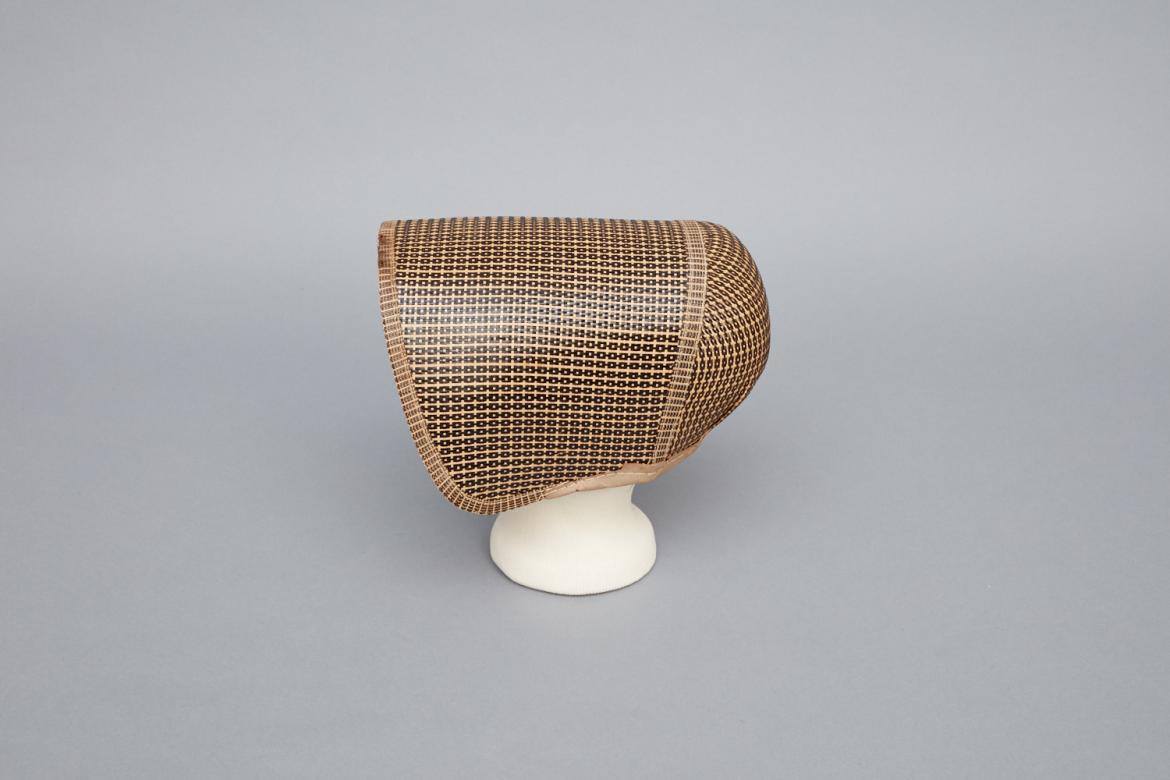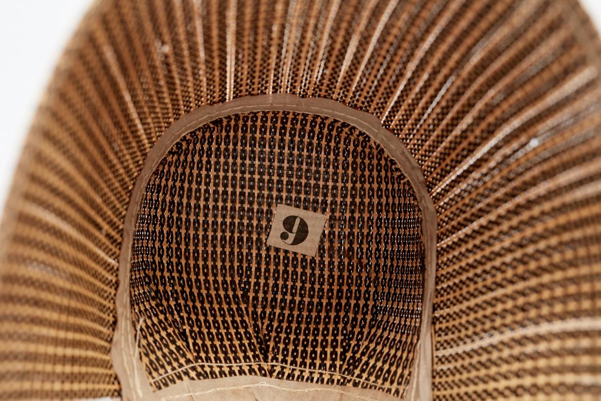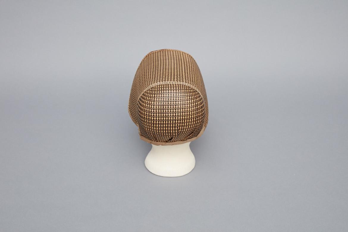Brown and natural woven straw with dissimilar weave on front edge and back seam (3/8" wide). Rounded crown with slight pleating of straw near the nape of the neck. No flounce or lining, but bottom edge (interior and exterior) and interior back seam covered with khaki canvas (1/2" wide outside, 1" wide inside).