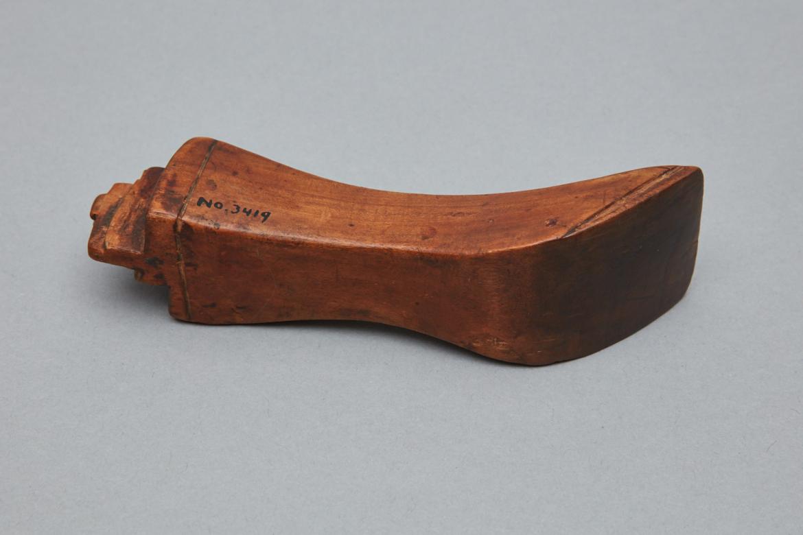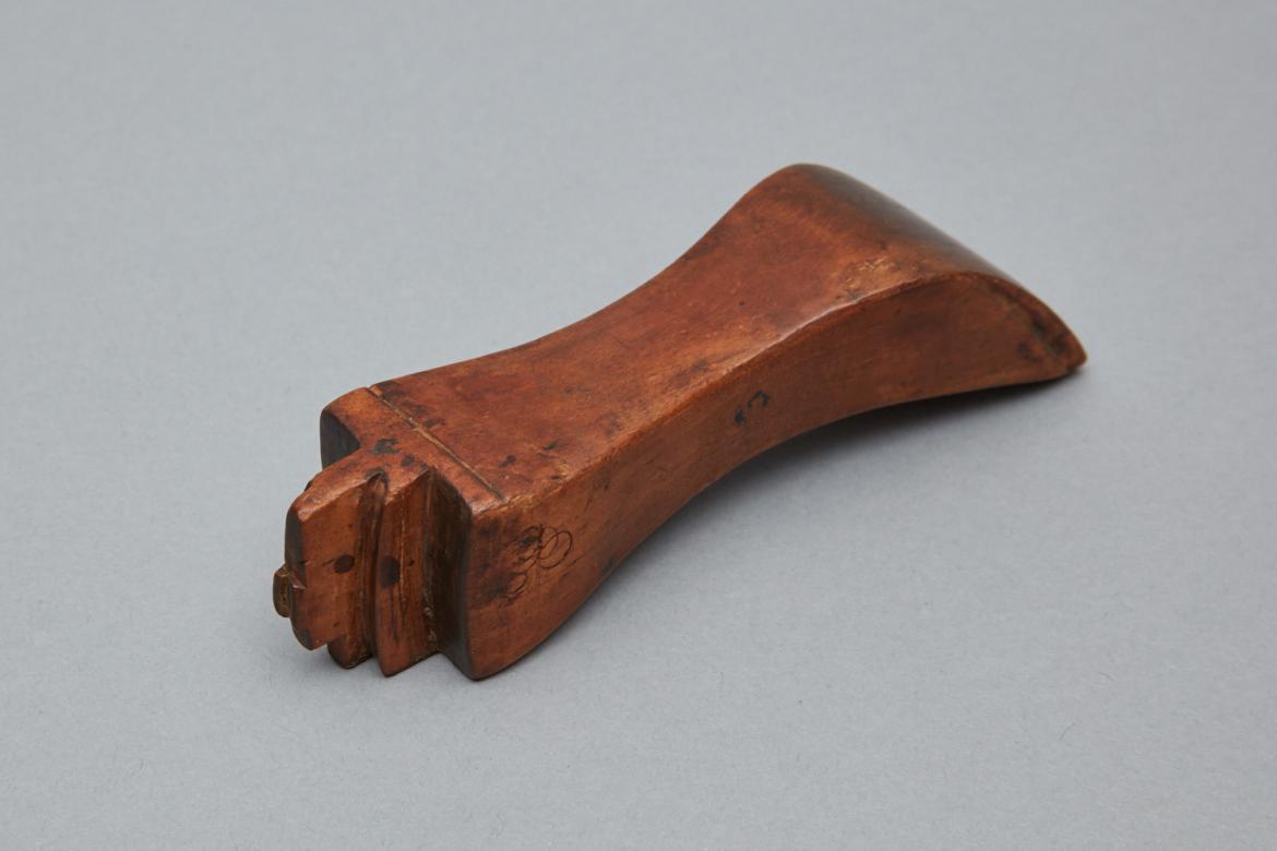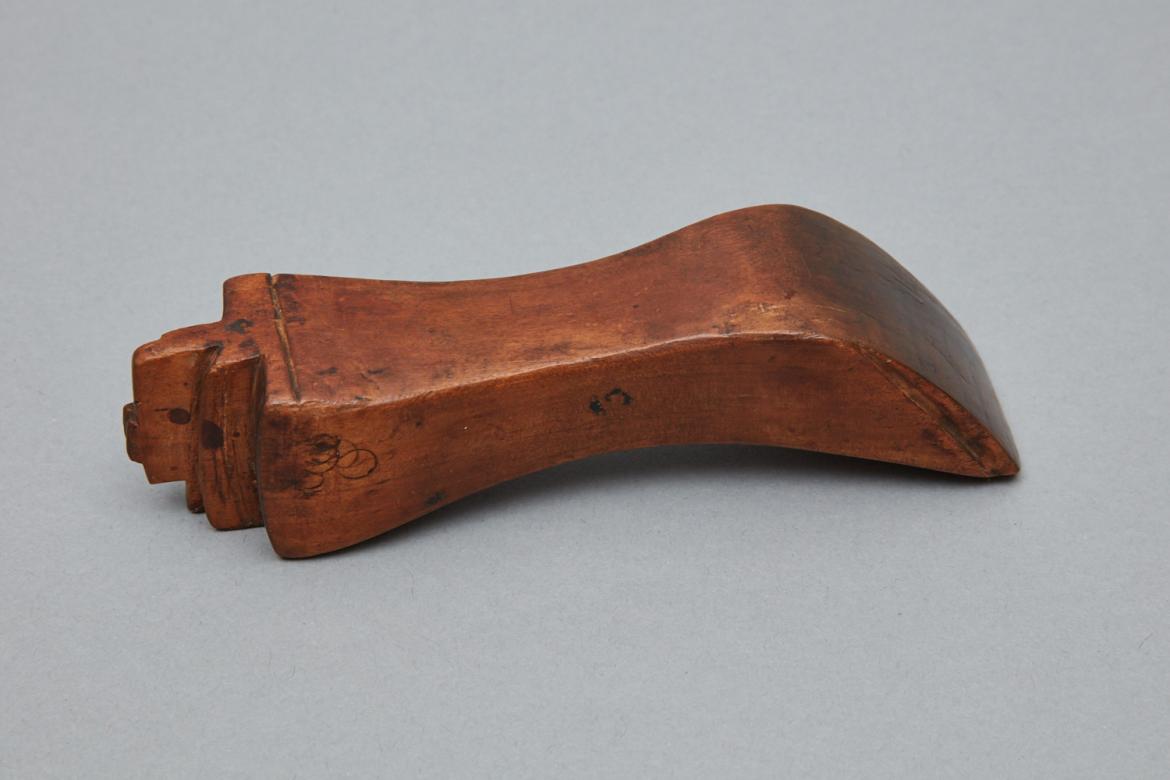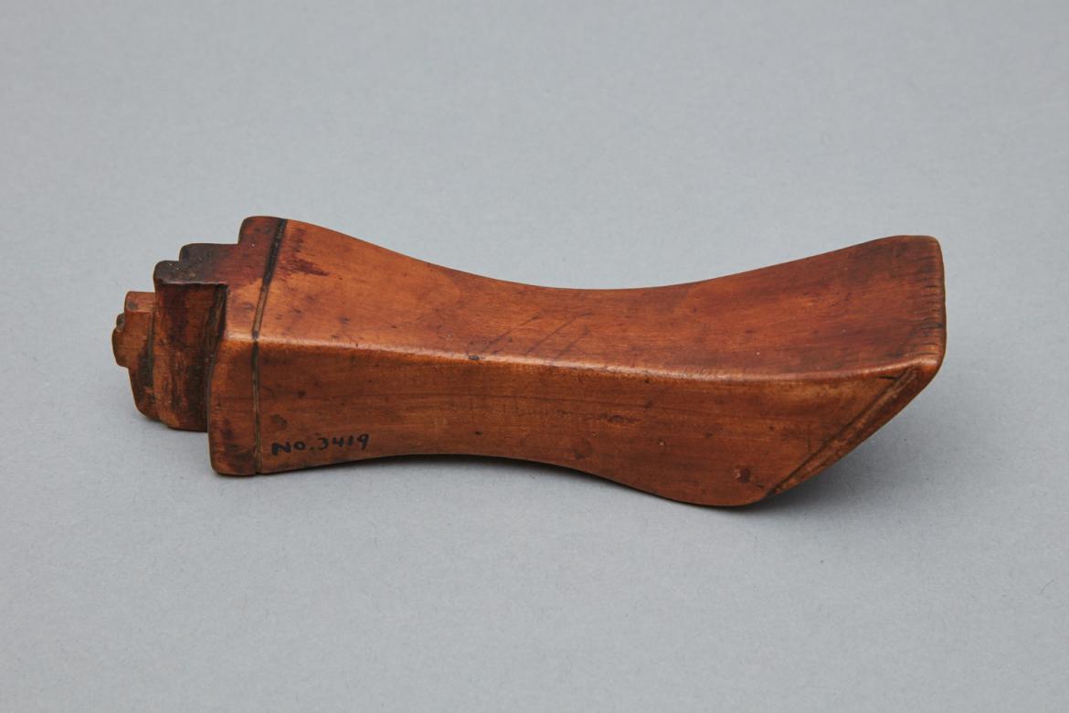 Wooden shoulder stick with an edge iron on one end. The edge iron is 1 1/8" wide with two steps on either side with a shared central step 1/8" wide and 11/16" high. The shared step is also cut down leaving a small square at the center of its top length. Three of the irons four sides have a line cut into them. The four sides taper toward the center of the stick with the top and bottom growing exponentially. The edges of the point where these two sides meet are rounded off. Similar lines which surround the edge iron are cut on the two flat sides of the shoulder stick.