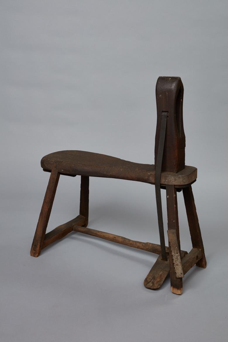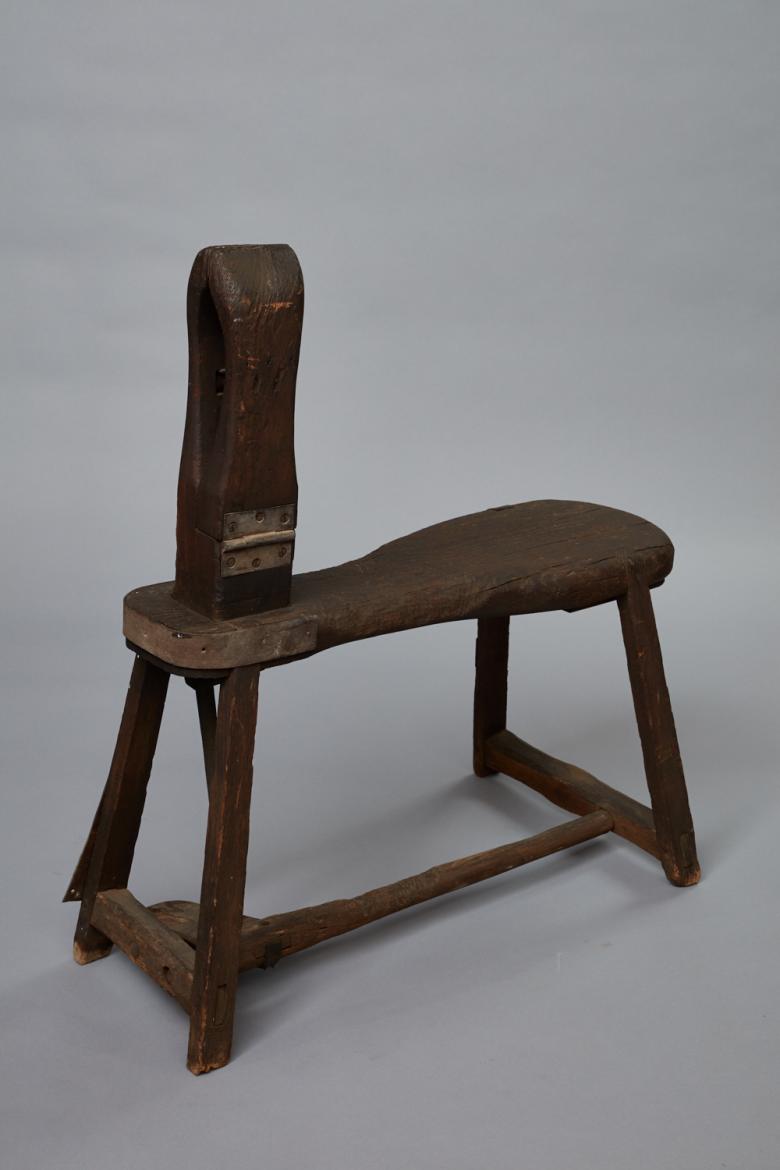 Leatherworking bench with a foot treadle. The bench has four lap-jointed legs which sit wider than the bench seat. The legs have a stretcher on each short side and a single stretcher in the middle which has a rectangular foot treadle set to one side. The treadle has a leather strap looped through and continues up and around the bench and through the vise. The vise has two wooden jaws which are rectangular at the base and are shaped to have curved edges and a neck which squares on the inside and has a curved exterior. It has a metal hinge on one side. The vise is set into the bench seat. The seat is 6 1/2" w and grows in width to 10 1/4" at the opposite end. The small end has a piece of metal attached.