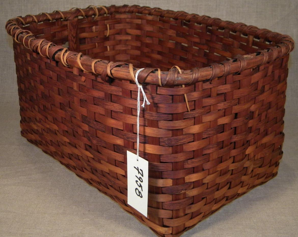 Rectangular black ash splint basket with split rim that is a combination of poplar and black ash lashing (some may be from a recent repair). Half-round rim. 1/2" uprights, 3/8" weavers. Open, plain weave base with 1" wide splints except near the center which is 3/8" wide. Handle lost.