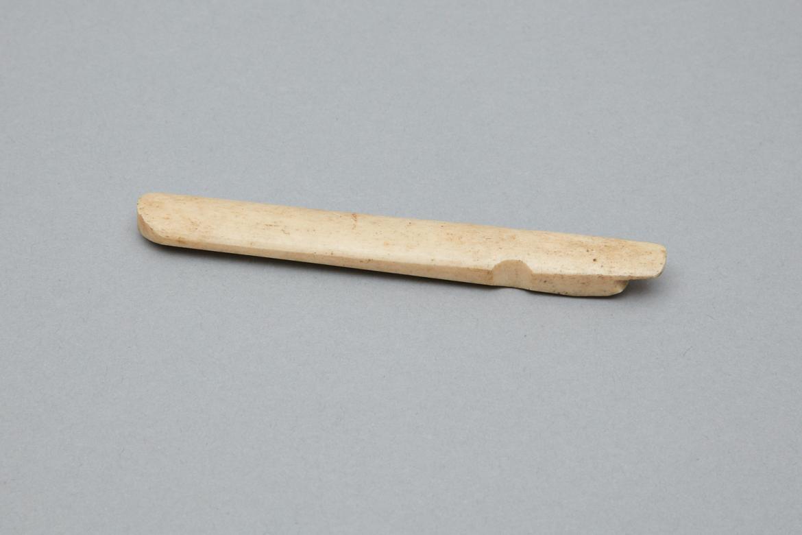 Bone edge iron. One rounded end, with straight sides, which at 3 1/8" the sides curve inward for 5/16". The iron tapers from this point until its 7/16" wide. The edges are shaved so they are wider on the bottom and taper as they reach the semi-circular finger rests. The bottom of the tapered edge curves slightly upward and meets a diagonal line. This cut-out leaves one side protruding 11/32".