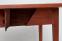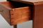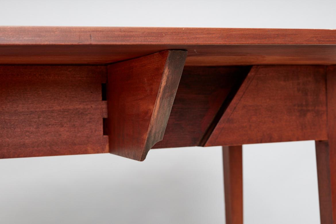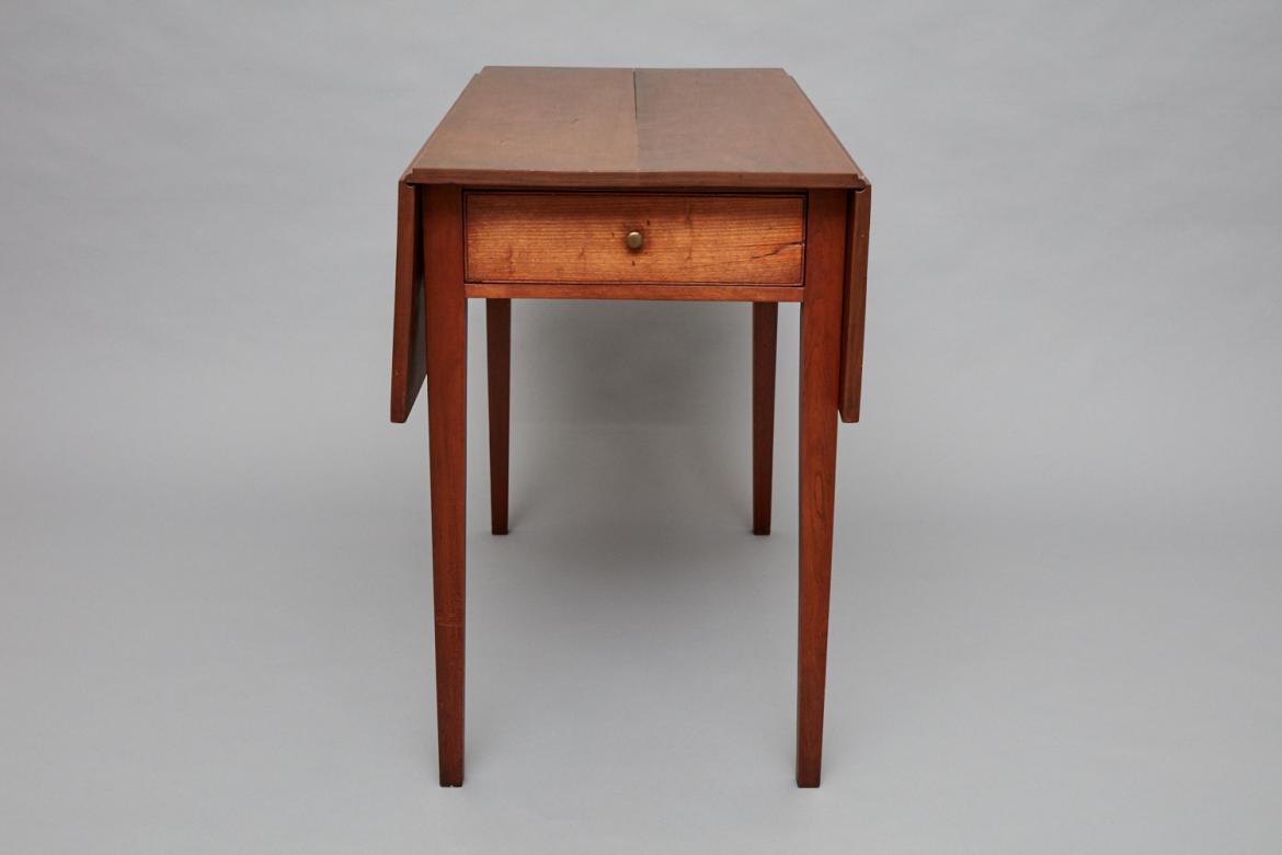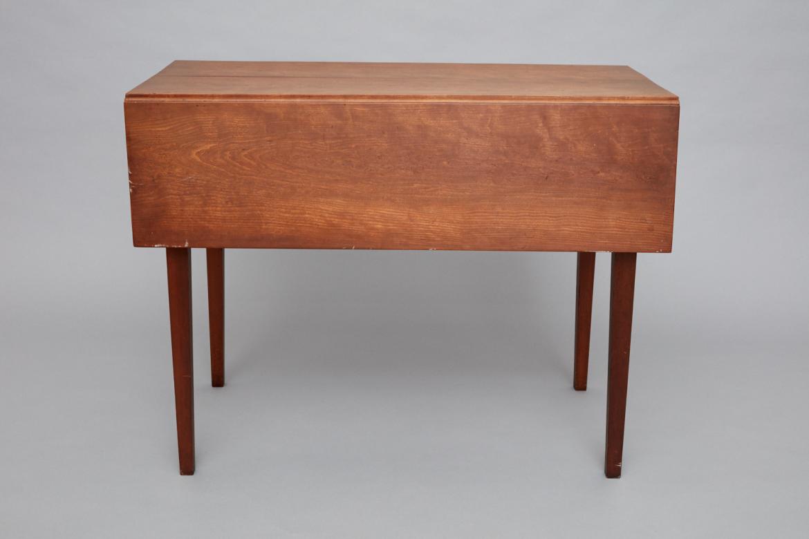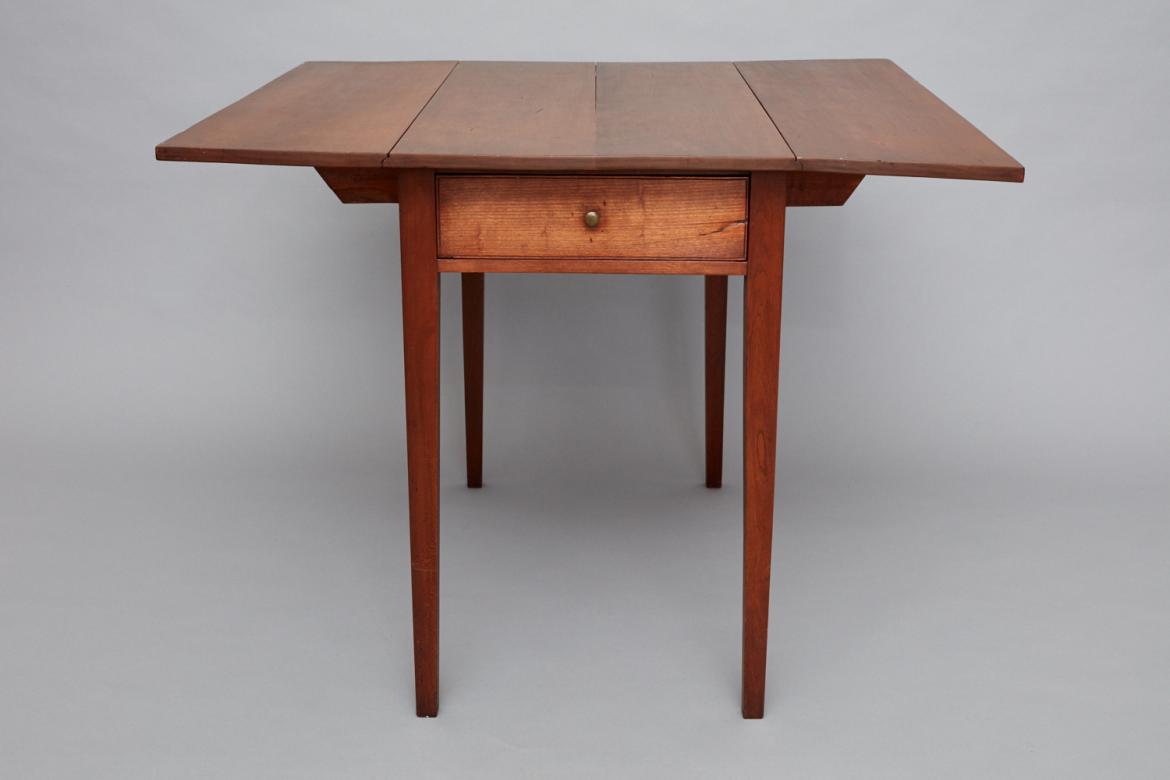 Drop-leaf table of cherry with white pine secondary. Double side apron construction with swing-out leaf supports which turn on knuckle joints. A single drawer which extends 26" into table. A brass knob is screwed to the drawer front. The table has four-square, tapered legs. Stained brown and clear-coated.