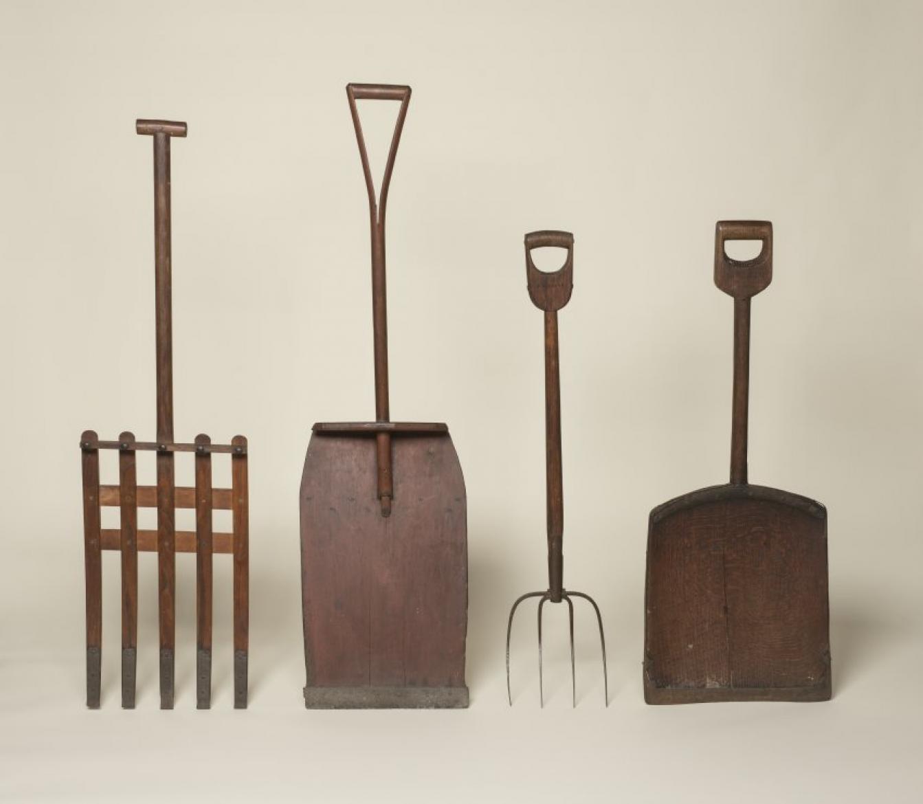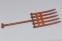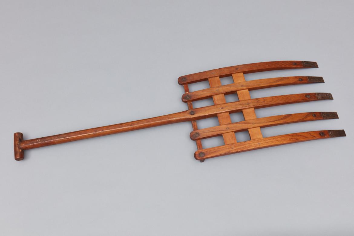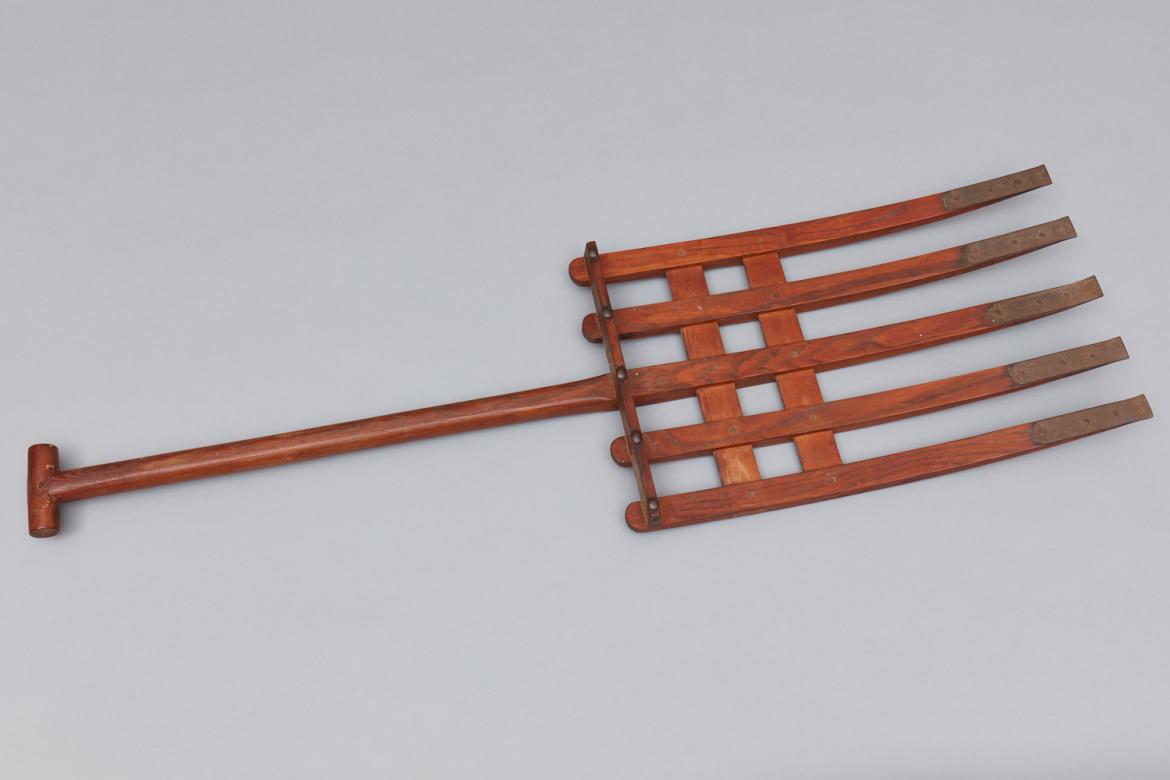 Shaving fork with five ash tines sawn to a gentile arc and pointed bottom end which is sheathed in sheet metal secured with rivets. The center tine continues aboves the fork, serving as a handle shaft. This shaft is mortised through a carved cherry dowel, forming a T-handle. The fork tines are spaced laterally by a cherry rail riveted to the upper side of the tines at the top of the fork. The fork is reinforced by two cherry boards extending laterally from edge to edge. These two boards are mortised through each tine and pinned with oak pegs.